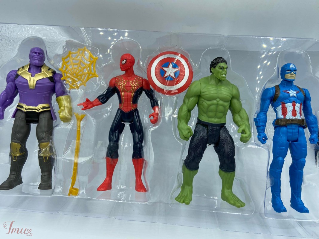 Super herojų figūrėlių rinkinys: Tanosas, Žmogus voras, Halkas, Kapitonas Amerika. Figūrėlės aukštis: 11,5 cm. Figūrėlės lankstosi.