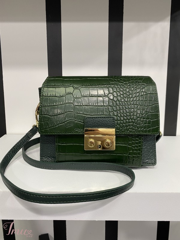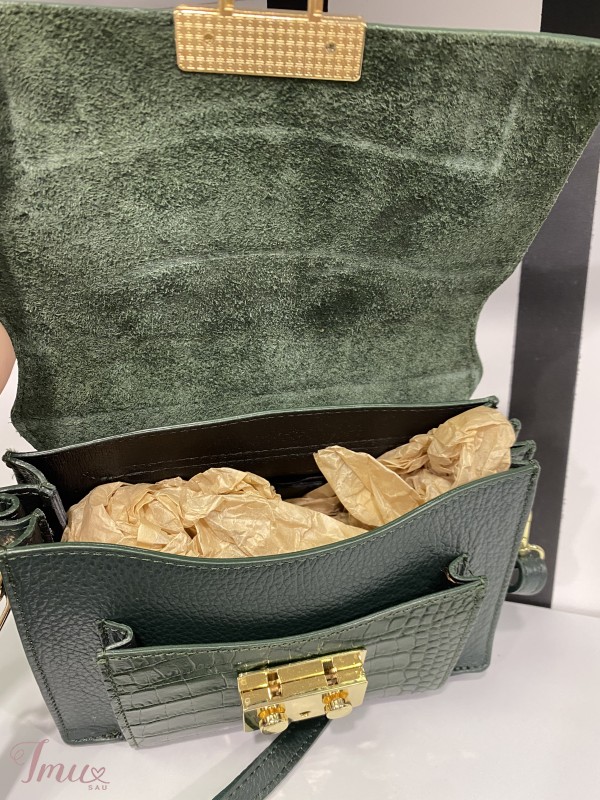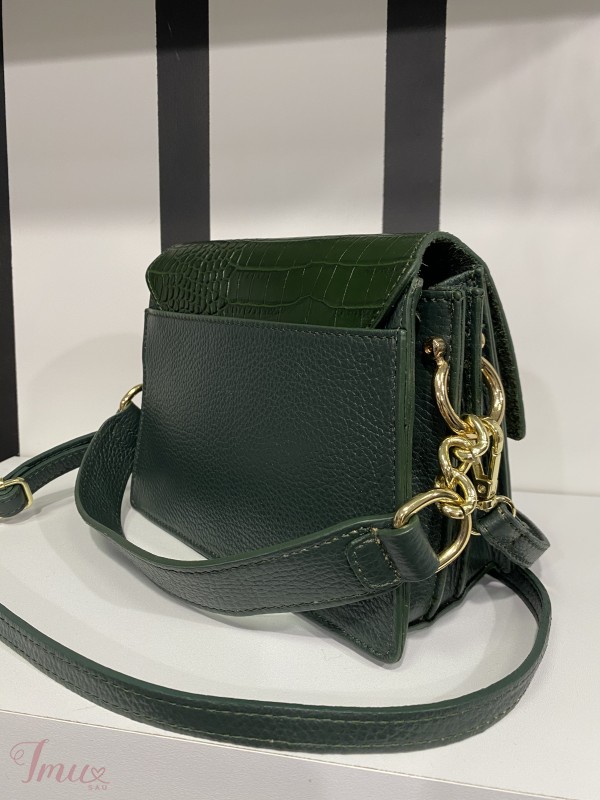 Tamsiai žalias odinis rankinukas per petį. Išmatavimai: 22x16x9