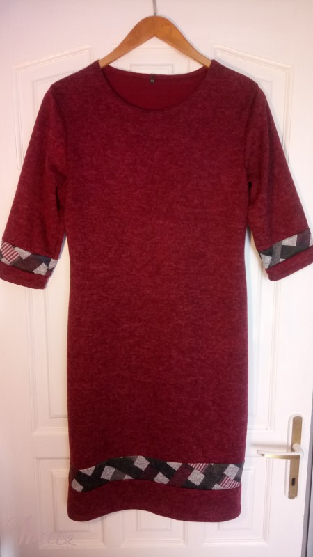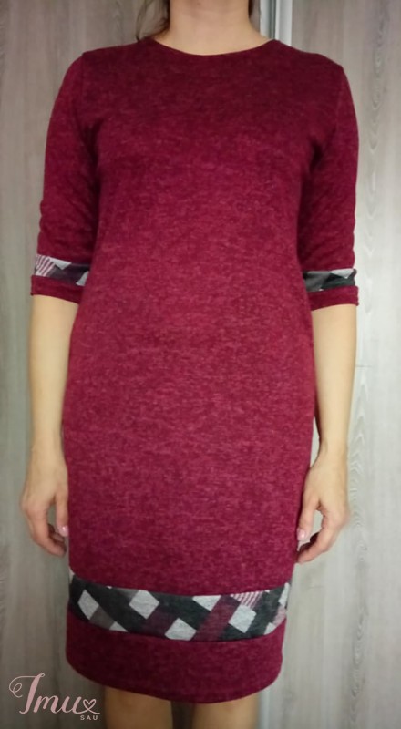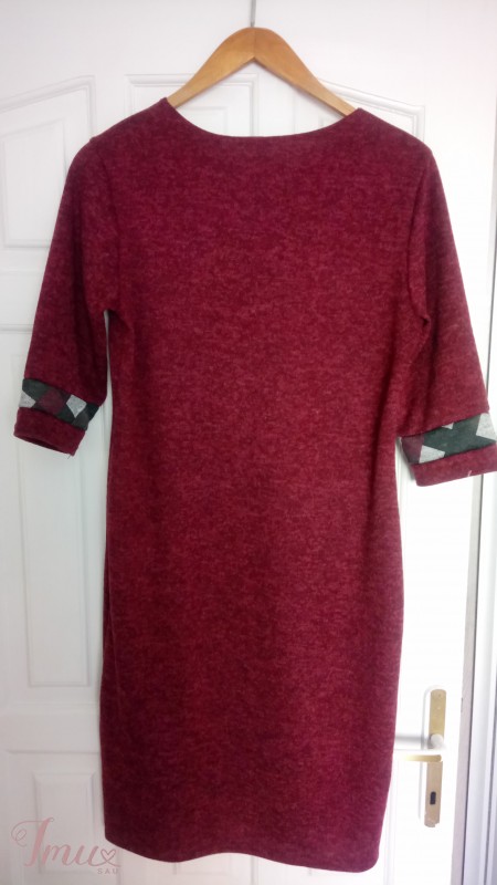 Švelnios medžiagos, tiesaus stiliaus, tampri, truputį įliemenuota suknelė. Išmatavimai: pečių ilgis 39 cm, plotis tarp pažastų 48 cm, liemuo 45 cmx2, klubai 48 cmx2, visas ilgis 100 cm, rankovių ilgis 40 cm. Sudėtis 95% poliesteris, 5% elastanas.