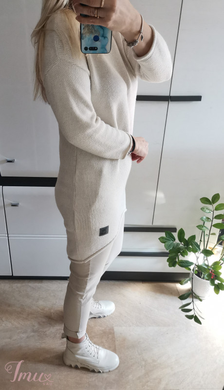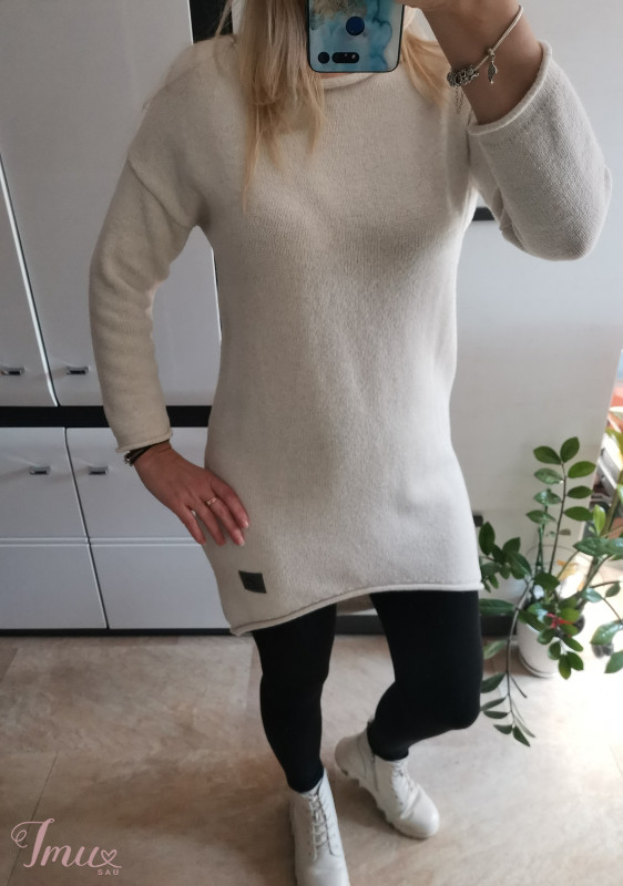 Galima vilket ant tympuciu, aptemptu dzinsiuku, odiniu kelnyciu arba kaip suknyte. Vilketa, tvarkinga. Galas ilgesnis. Rankovytes biskuti trumpintos. Visas ilgis priekio 75cm, galo 95cm. Po pazastukais 50cm, per klubus apie 50cm. Dydi raso uni. Fotografuota ant 40 dydi devincios. Siunciu