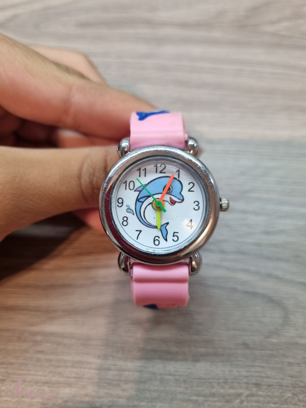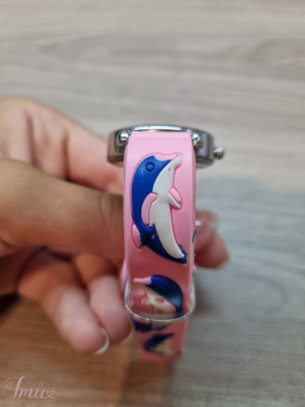 Vaikiškas rausvos spalvos laikrodukas, su delfinais. Ant ciferblato taip pat yra delfino atvaizdas. Laikrodžio rodyklės yra skirtingų spalvų :).