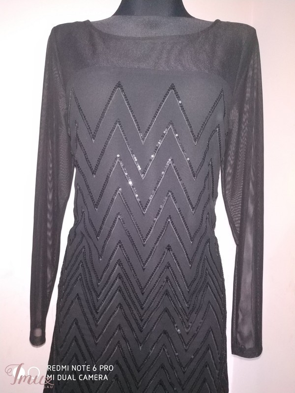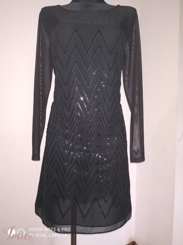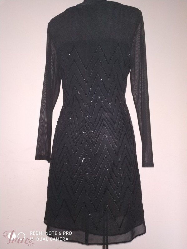 Krūtinė 95-98 cm., liemuo 80-85 cm., klubai 104 cm., rankovės ilgis nuo peties siūlės 60 cm., pečių plotis 38 cm., visas ilgis 94 cm. Suknelė nesitampo.