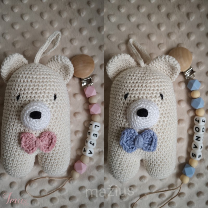 RINKINUKAS KŪDIKIUI 😍😍 😍Barškantis žaisliukas su kilpele 😍VARDINIS silikoninių karoliukų čiulptuko laikiklis 😍Visos žaisliuko detalės saugiai prisiūtos/išsiuvinėtos 😍Meškutis tinkamas naudoti net patiems mažiausiems kūdikėliams ! Žaisliuko ūgis (be kilpelės) ~15cm Čiulptuko laikiklio ilgis priklauso nuo vardo ilgumo :) Vieno rinkinuko kaina - 11e Kaina - 11e (siuntimas NEMOKAMAS). Papildomas apnertas medinis žiedelis (kramtukas) +1,5e