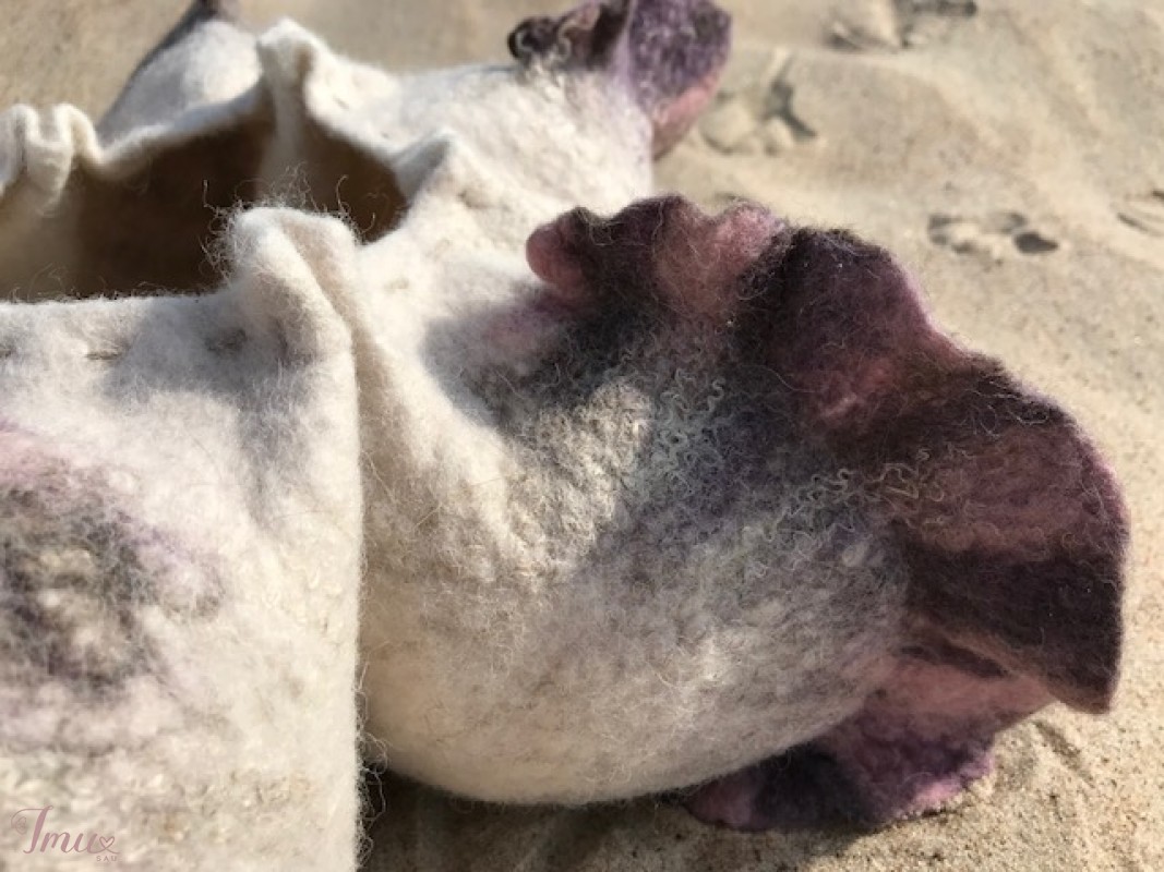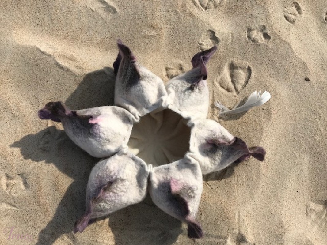 Dekoratyvus objektas (vaza) namų puošybai iš vilnos "Jūros žvaigždė". Objektas sukurtas naudojant sudėtingą 3D šešių dalių šabloną, puošybai panaudotos lino pluošto sruogos. Vaza gali būti įvairiai komponuojama, naudojant pagrindinį šešiakampį objektą ir mažą vazelę. Daugiau mano darbų galite pažiūrėti: https://www.facebook.com/Magicfeltdesigns/
