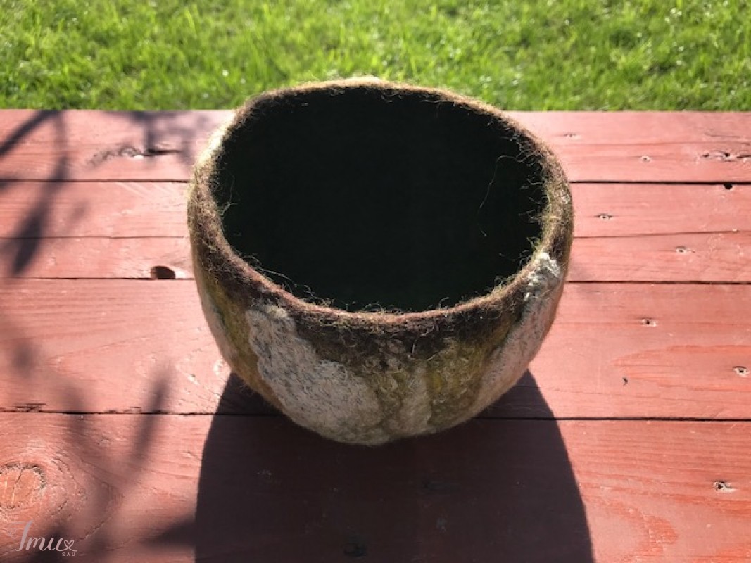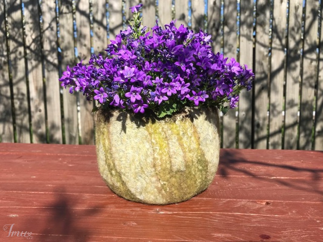 Vaza pagaminta šlapiuoju vėlimo būdu iš natūralios avių vilnos. Medžio žievės faktūros ir spalvos efektas pasiektas, įveliant natūralias lino sruogas bei megztą trikotažinį audinį. Darbe dominuoja miško spalvos: įvairių atspalvių žalia bei ruda. Vienetinis rankų darbo gaminys papuoš jūsų namus ar bus originali dovana. Daugiau mano darbų galite pažiūrėti: https://www.facebook.com/Magicfeltdesigns/