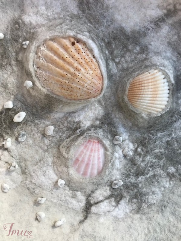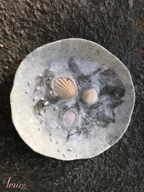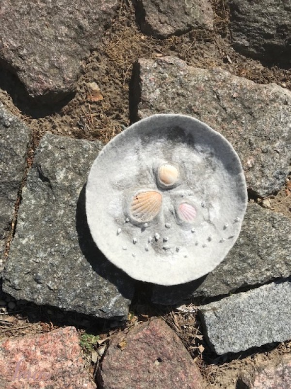Lėkštė „Smėlis“. Lėkštė nuvelta iš merino avių vilnos. Darbo puošybai panaudota medvilnė ir įveltos kriauklės bei siuvinėjimas karoliukais. Dominuoja švelnios pajūrio smėlio spalvos. Sukurti darbą įkvėpė Lietuvos gamta, Baltijos pajūris. Lėkštę galima naudoti kaip dekoro elementą namuose, smulkiems daiktams susidėti arba pakabinti ant sienos. Daugiau mano darbų galite pažiūrėti: https://www.facebook.com/Magicfeltdesigns/