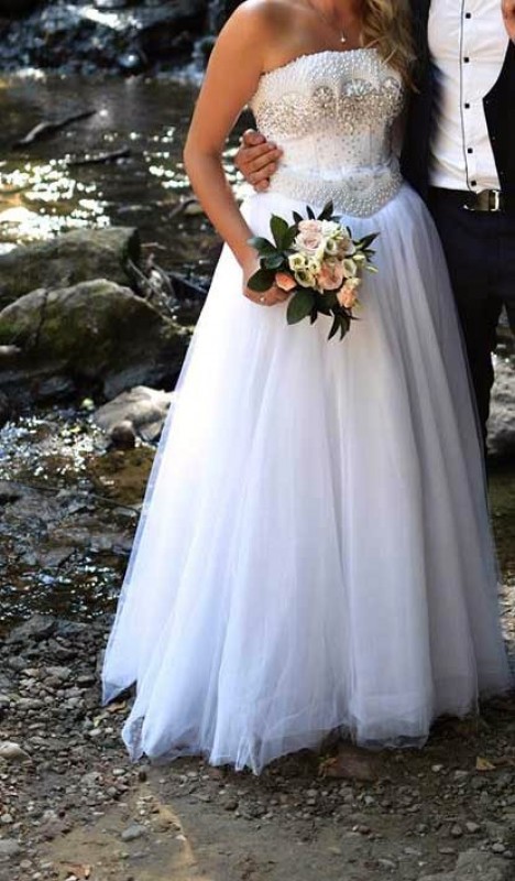 Vestuvinė suknelė. Išvalyta, sutvarkyta. Viršus puoštas karoliukais, sijonas tiulinis. Nugaroje suvarstoma, todėl tiks S/M dydžiui. Didesniam dydžiui nebe, nes priekis labai priglunda. Dėvima be liemenėlės, viršus pakietintas ir įliemenuotas. Galima pasimatuoti Kaišiadoryse, Saulės efektas salone.