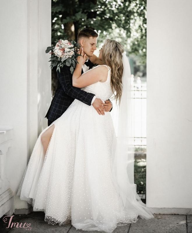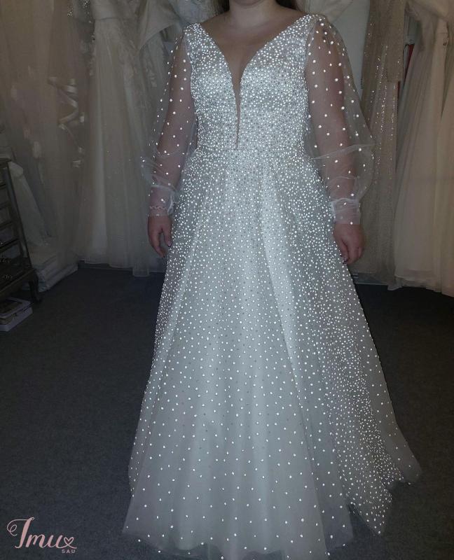 Ieškai išskirtinės suknelės savo ypatingai dienai? 🤍Ši nuostabi, žvilganti suknelė – kaip tik tau! 🤍Dėvėta vieną kartą, puikiai išlaikyta, atrodo kaip nauja.🤍 Suknelės ypatybės: • Dydis: L/XL ( atsiųsčiau išmatavimus suknelės) • Spalva: Pieno baltumo • Stilius: A siluetas, su V formos iškirpte ir ilgu šleifu. • Rankovės: Permatomos, dekoruotos blizgučiais, su švelniu pūstumu. • Medžiaga: Tiulis su siuvinėtais blizgučiais – žėri šviesoje • Būklė: Dėvėta tik vieną kartą, profesionaliai išvalyta • Papildomai: Galima pasimatuoti vietoje, siunčiu į kitus miestus, pridedu nuometą, lanką. Kaina: 550eur – galima derėtis Vieta: Šiauliai / siunčiu visoje Lietuvoje