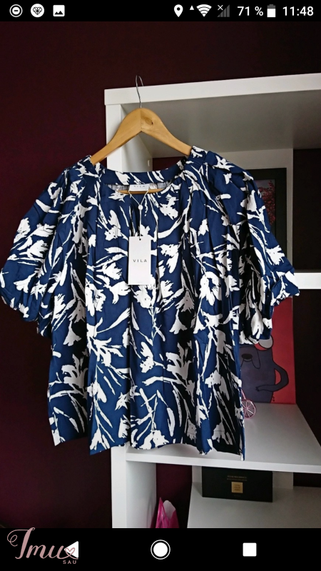 Laisvo stiliaus palaidinė su rankovėmis iki alkūnių. Pūstų rankovių viduje yra gumutės. Rašo S, bet drąsiai tiks ir M nešiojančiai. Dėl daugiau foto rašykite.