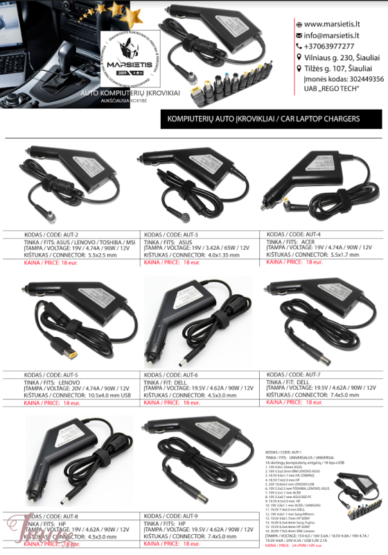 VISI Nešiojamų kompiuterių mašininiai automobiliniai pakrovėjai Pristatymas visoje Lietuvoje per 1-2 d.d. (DPD kurjeriu, paštomatu, paštu, galima atsiimti vietoje). Suteikiama garantija 12 mėnesių. Visa konsultacija, remonto darbų užsakymas: +37063977277 / info@marsietis.lt / Vilniaus 230, Šiauliai arba Tilžės 107, Šiauliai Daugiau informacijos: www.marsietis.lt 1. (AUT-1) UNIVERSALUS 90W | 16 ANTGALIŲ+USB automobilinis kroviklis. Kaina 29 eur. 1. 19V 4.0x1.35mm ASUS 2. 16V 5.5x2.5mm IBM LENOVO ASUS 3. 18.5V 4.8x1.7 mm HP, COMPAQ 4. 18.5V 7.4x5.0 mm HP 5. 20V 10.0x4.0 mm LENOVO USB 6. 19V 5.5x2.5 mm TOSHIBA, LENOVO, ASUS 7. 19V 5.5x1.7 mm ACER 8. 19V 2.5x0.7 mm ASUS EEE PC 9. 19.5V 4.5x3.0 mm HP 10. 19V 3.0x1.1 mm ACER / SAMSUNG 11. 19.5V 7.4x5.0 mm DELL 12. 19V 4.0x1.7 mm Sony/HPmini 13. 19.5V 4.8x1.7mm HP SONY 14. 16.0V 6.5x4.4mm Sony, Fujitsu 15. 19.5V 6.5x4.4mm HP SONY 16. 20.0V 7.9x5.4mm IBM, Lenovo 17. USB 2. (AUT-2) ASUS, TOSHIBA, LENOVO, MEDION, MSI, FUJITSU | 5.5x2.5mm + USB | 19V | 4.74A | 90W | mobilinis kroviklis. Kaina 18 eur. 3. (AUT-3) ASUS | 4.0x1.35mm + USB | 19V | 3.42A | 65W | automobilinis kroviklis. Kaina 18 eur. 4. (AUT-4) ACER, PACKARD BELL| 5.5x1.7mm + USB | 19V | 4.74A | 90W | automobilinis kroviklis. Kaina 18 eur. 5. (AUT-5) LENOVO | 10.5x4.0mm + USB | 20V | 4.74A | 90W | automobilinis kroviklis. Kaina 18 eur. 6. (AUT-6) DELL| 4.5x3.0mm + USB | 19.5V | 4.62A | 90W | automobilinis kroviklis. Kaina 18 eur. 7. (AUT-7) DELL| 7.4x5.0mm + USB | 19.5V | 4.62A | 90W | automobilinis kroviklis. Kaina 18 eur. 8. (AUT-8) HP | 4.5x3.0mm + USB | 19.5V | 4.62A | 90W | automobilinis kroviklis. Kaina 18 eur. 9. (AUT-9) HP | 7.4x5.0mm + USB | 19.5V | 4.62A | 90W | automobilinis kroviklis. Kaina 18 eur. Pristatymas visoje Lietuvoje per 1-2 d.d. (DPD kurjeriu, paštomatu, paštu, galima atsiimti vietoje). Suteikiama garantija 12 mėnesių. Visa konsultacija: +37063977277 / info@marsietis.lt / Vilniaus 230, Šiauliai arba Tilžės 107, Šiauliai Daugiau informacijos: www.marsietis.lt Pakrovėjai, automobiliniai, mašininiai, universalus, įkrovikliai, krovikliai, laptop chargers for car, 12V, pigiausiai... MODELIAI: 0A36258, 0A36259, 0A36260, 0A36261, 0A36262, 0A36263, 0A36264, 0A36265, 0A36266, 0A36267, 0A36268, 0A36269, 0A36270, 0A36271, 0A36272, 0A36273, 0B46994, 0B47008, 112012-11, 36200235, 36200236, 36200237, 36200252, 36200254, 36200298, 45N0235, 45N0236, 45N0237, 45N0238, 45N0239, 45N0240, 45N0245, 45N0246, 45N0249, 45N0250, 45N0253, 45N0254, 45N0256, 45N0258, 45N0260, 45N0262, 45N0264, 45N0305, 45N0306, 45N0309, 45N0310, 45N0326, 45N0328, 59340248, ADLX65NCC3A, ADLX65NDC3A, ADLX65NLC3A, ADLX90NCC3A, ADLX90NCT3A, ADLX90NDC3A, ADLX90NLC3A, ADLX90NLT3, ADLX90NLT3A, PA-1900-72, IdeaPad, Yoga 11, 11S, 13, ThinkPad E531 Edge, E431, S3, S5, T431s, X1, Carbon, X230s, Lenovo, 0B46995, 0B46996, 0B46997, 0B46998, 0B46999, 0B47000, 0B47001, 0B47002, 0B47003, 0B47004, 0B47005, 0B47006, 0B47007, 0B47009, 23535UF, 3443, Series 3443-CTO, 3443CTO, 3444, 3444-25U, 3444-28U, 3444-2DU, 3444-2GU, 3444-2HU, 3444-2KU, 3444-4ZU, 3444-52U, 3444-53U, 3444-54U, 3444-55U, 3444-56U, 3444-59U, 3444-5AU,3444-AWU, 3444-AZU, 3444-B7U, 3444-B8U, 3444-B9U, 3444-BAU, 3444-BBU, 3444-BCU, 3444-BDU, 3444-BEU, 3444-BFU, 3444-F7U, 3444-F8U, 3444-F9U, 3444-FAU, 3444-FBU, 3444-FCU, 3444-FDU, 3444-FEU, 3444-FFU, 3444-FGU, 344425U, 344428U, 34442DU, 34442GU, 34442HF, 34442HU, 344456U, 3444AZF, 3444AZU, 3444B7U, 3444B8U, 3444BAU, 3444BDU, 3444CUF, 3444CUU, 3444CWU, 3444F9U, 3444FEU, 3446, 3448, 3448-22U, 3448-23U, 3448-24U, 3448-25U, 3448-2MU, 3448-34U, 3448-35U, 3448-39U, 3448-3AU, 3448-58U, 3448-59U, 3448-5AU, 3448-5BU, 3448-5CU, 3448-5DU, 3448-94U, 3448-95U, 3448-AVU, 3448-AWU, 3448-AXU, 3448-AYU, 3460, 3460-22U, 3460-23U, 3460-24U, 3460-25U, 3460-34U, 3460-35U, 3460-36U, 3460-37U, 3460-58U, 3460-59U, 3460-5AU, 3460-5BU, 3460-5CU, 3460-5DU, 3460-AVU, 3460-AWU, 3460-AXU, 3460-AYU, 3460-AZU, 3460-B2U, 3460/i5/i7, 34607ZG, 3462, 3463, N3N25UK, N3N2SGE, N3N2SUK, N3N4LGE, N3N4MGE, N3N72GE, N3N72UK, N3N7YMD, N3N7ZGE, N3N7ZUK, N3N82GE, N3N82UK, N3NANGE, Touch 3444CYU, Win 8 i5-3317U, i5-3427U, i7-3667U, i7-3667UM, win Thinkpad Square, interfaces with pin Fit Models: (3444), (3448), (3460), 3460-23U3460-22U PA-1900-72IF, 45N0242, 45N0248, 45N0252, 36200252 45M0246, 62775AU/i5-3230M IdeaPad B490; IdeaPad B490s; IdeaPad Flex14; IdeaPad Flex15; IdeaPad G400; IdeaPad G405; IdeaPad G405s; IdeaPad G500; IdeaPad G500s; Ideapad G505; IdeaPad G505s; IdeaPad G510; IdeaPad G700; IdeaPad S210 Touch; IdeaPad S510p; IdeaPad U330 Touch; IdeaPad U330p; IdeaPad U430p;IdeaPad U530; IdeaPad Yoga 11; IdeaPad Yoga 11S; IdeaPad Yoga 13; IdeaPad Z510; IdeaPad Z710; ThinkPad E531; ThinkPad Edge E431; ThinkPad S3; ThinkPad S5; ThinkPad T431s; ThinkPad T440; Thinkpad T440p; Thinkpad T440S; ThinkPad T540P; ThinkPad X1 Carbon; ThinkPad X230s; U430. 36200235; 36200236; 36200237; 36200252; 36200254; 36200298; 45N0235; 45N0236; 45N0237; 45N0238; 45N0239; 45N0240; 45N0245; 45N0246; 45N0249; 45N0250; 45N0305; 45N0306; 45N0309; 45N0310;ADLX90NCC3A; ADLX90NDC3A; ADLX90NLC3A; PA-1900-72; 0B46994; 0B46995; 0B46996; 0B46997; 0B46998; 0B46999; 0B47000; 0B47001; 0B47002; 0B47003; 0B47004; 0B47005; 0B47006; 0B47007; 0B47008; 0B47009. 0A36258; 0A36259, 0A36260;0A36261;0A36262;0A36263; 0A36264; 0A36265; 0A36266; 0A36267; 0A36268; 0A36269; 0A36270; 0A36271; 0A36272; 0A36273; 0B46994; 0B46995; 0B46996; 0B46997; 0B46998; 0B46999; 0B47000; 0B47001; 0B47002; 0B47003; 0B47004; 0B47005; 0B47006; 0B47007; 0B47008; 0B47009; 112012-11; 36200235; 36200236; 36200237; 36200252; 36200254; 36200298; 36200604; 36200608; 36200612; 45M0246; 45N0235; 45N0236; 45N0237; 45N0238; 45N0239; 45N0240; 45N0242; 45N0245; 45N0246; 45N0248; 45N0249; 45N0250; 45N0252; 45N0253; 45N0254; 45N0256; 45N0258; 45N0260; 45N0262; 45N0264; 45N0305; 45N0306; 45N0309; 45N0310; 45N0326; 45N0328; 59340248; ADLX65NCC3A; ADLX65NDC3A; ADLX65NLC3A; ADLX90NCC3A; ADLX90NCT3A; ADLX90NDC3A; ADLX90NLC3A