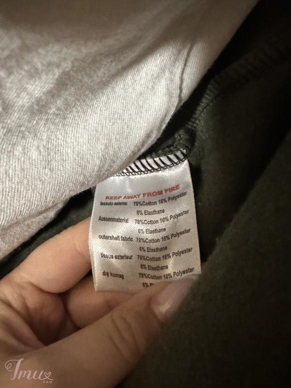 išmatavimai: krūtinės sritis 114cm, ilgis nuo peties 67cm, rankovės ilgis nuo kaklo siūlės 80cm, Kelnių liemuo 74cm,/tempiasi iki 98cm, klubai 112cm, ilgis 102cm