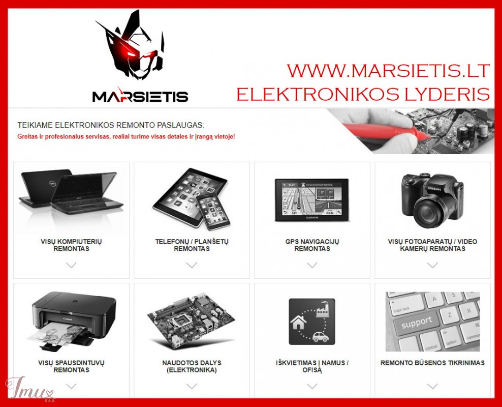 WWW.MARSIETIS.LT - ELEKTRONIKOS LYDERIS VISOJE LIETUVOJE VISŲ KOMPIUTERIŲREMONTAS - Atliekamas bet kokio sudėtingumo remontas. Turime visas reikalingas detales ir įrangą vietoje. Suteikiama konsultacija ir diagnostika. TELEFONŲ / PLANŠETŲ REMONTAS - Keičiame, taisome, perrašome, atgaiviname įvairius telefonus, planšetus, greitai, kokybiškai ir patikimai. GPS NAVIGACIJŲREMONTAS - Atliekame visas paslaugas susijusias su GPS navigacijomis. Konsultuojame apie GPS įsigyjimo ar kitais klausimais. VISŲ FOTOAPARATŲ / VIDEO KAMERŲ REMONTAS - Remontuojame įvairių gamintojų skaitmeninius fotoaparatus, video kameras ir jų priedus. Visus darbus atliekame greitai, kokybiškai, darbams suteikiame garantijas. VISŲ SPAUSDINTUVŲ REMONTAS - Teikiame visų tipų spausdintuvų, kopijuoklių, faksų aparatų, daugiafunkcinių įrenginių techninį servisą. Atliekame rašalinių ir lazerinių spausdintuvų kasečių pildymą. NAUDOTOS DALYS (ELEKTRONIKA) - Prekiaujame naudota elektronika ir jos dalimis. Gausus pasirinkimas ir garantija. IŠKVIETIMAS Į NAMUS /OFISĄ - Skubus kompiuterių meistro iškvietimas į namus ir ofisą. Įmonių reguliari ir ilgalaikė priežiūra. Išrašome PVM sąskaitas faktūras. REMONTO BŪSENOS TIKRINIMAS - Galite patikrinti Jūsų remonto užsakymo būseną. www.marsietis.lt / +37067701977 / Vilniaus g. 230, Šiauliai / Tilžės 107, Šiauliai / info@marsietis.lt Nesvarbu iš kokio miesto esate, mūsų kurjeris paims sugedusį įrenginį ir pristatys Jums veikiantį. Mokėjimas po pristatymo.