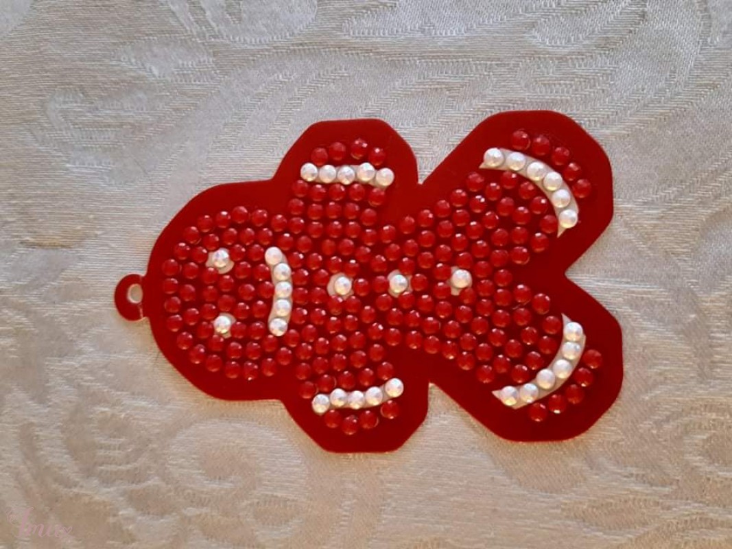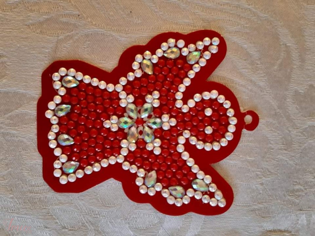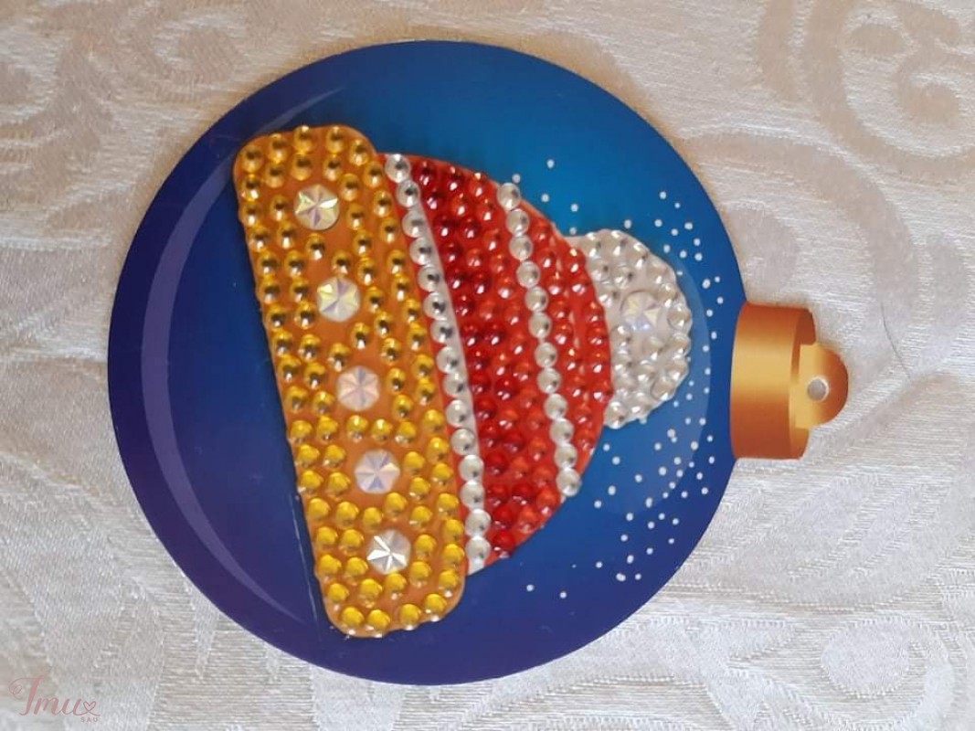 Popieriniai žaisliukai dekoruoti deimančiukais. Galima kabinti ant eglutės, galima pridėti prie dovanos. Kitoje pusėje galima užrašyti palinkėjimą. Baltai raudoni plonesni ir sunkiau laikosi pakabinimas, bet sutvirtinti iš kitos pusės. Kaina 0,8-1€