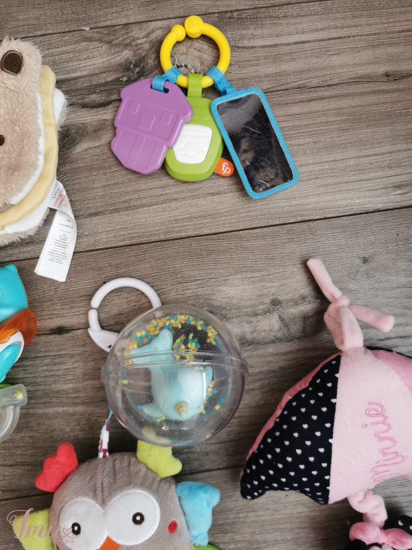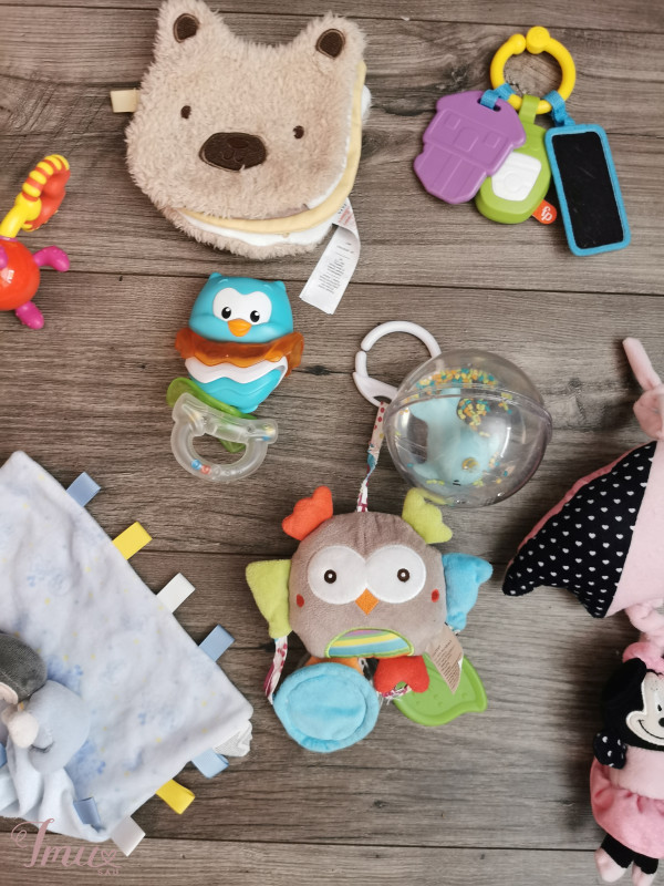 Žaislų bukle labai gera, natūralios naudojimo žymės Pakabinama pelėda, barška, čeža, veidrodėlis pasibraižes Melynas merliukas barška Krabas - sukiojasi žnyples Pelėda - sukiojasi, barška Rožinė pagalvele, patraukus groja Knygutė naują tik išskalbta, cypsi, yra veidrodėlis Fisher price raktai, barška veidrodėlis pasibraizes Fisher price maudynių kamuoliukas, tinkantis žaisti ir ant žemės ir vonioje, šiek tiek pasibraizes, bet naudotas labai mažai.