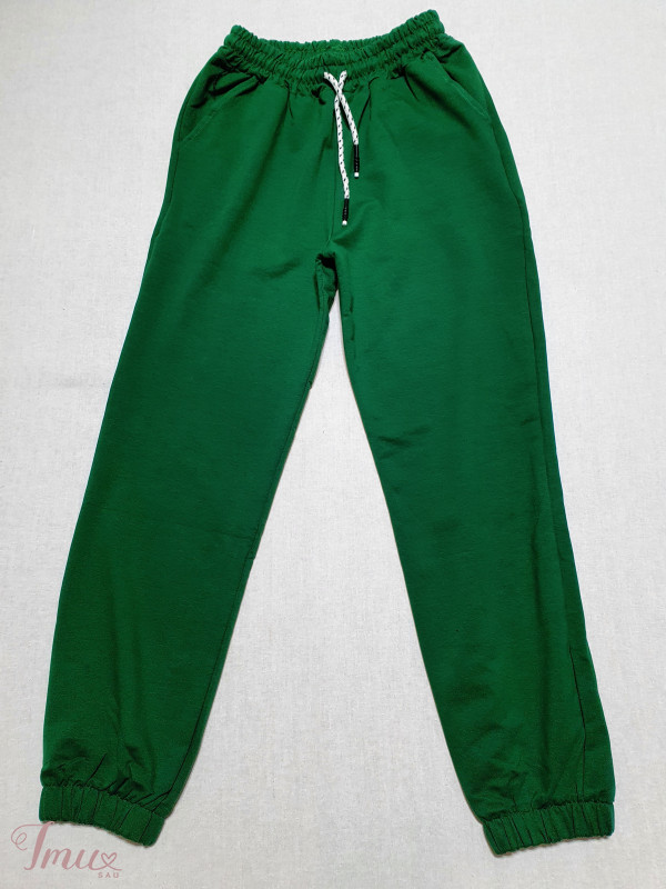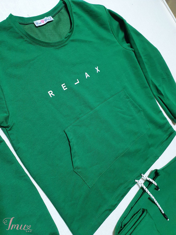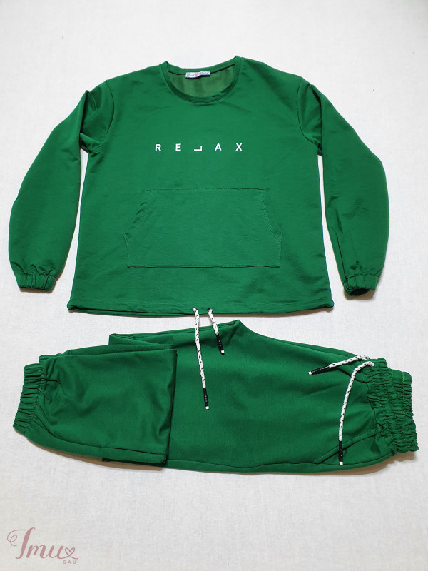 L dydis, medvilninis, moteriškas kostiumas. Džemperio krūtinės apimtis 54×2cm, ilgis 64cm. Kelnių liemuo 35-45×2cm, klubai 55×2cm, ilgis 105cm.