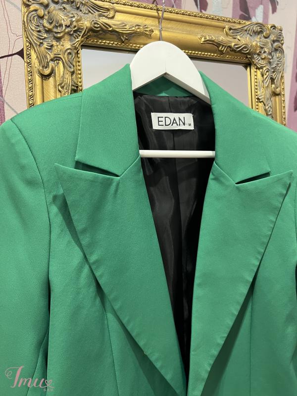 Nuostabus Edan žalias švarkas, max 2 kartus devėtas, ryški žalia spalva, be defektų. Per krūtinę 96cm, pečiai 39cm, ilgis 70cm, su petukais.