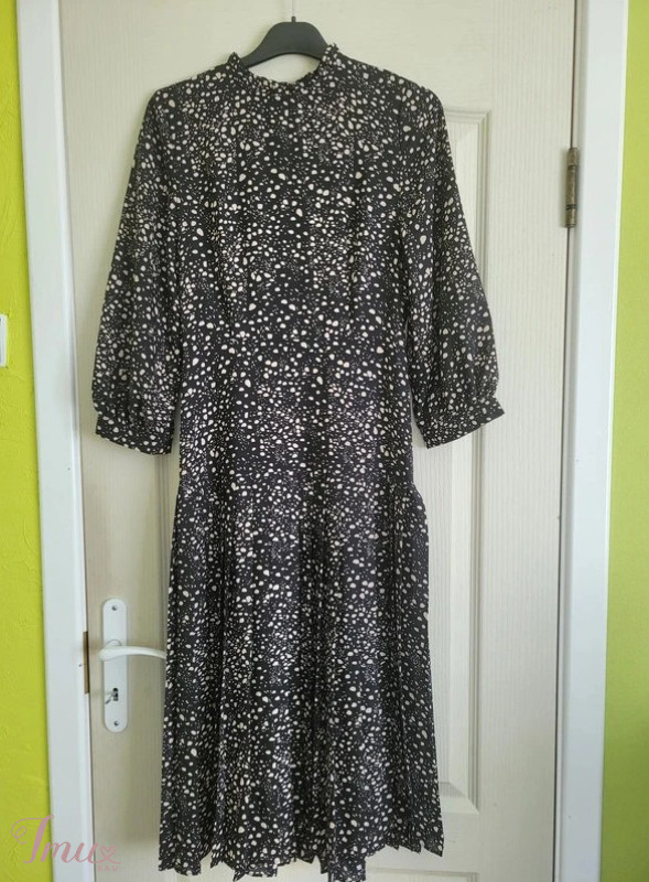 ZARA firmos nauja suknelė. Man deja mažoka. Audinį su faktūra puošia kremo spalvos #taškeliai. Rankovės 3/4 ilgio. #Apykaklė #paaukštinta, padailinta karbatkėle. Apačia plisuota. Modelis užsisega nugaroje saga apsiūta audiniu. Nugaroje į juosmenį įverta guma. Per krūtinę - 46 cm. Per juosmenį - 36 cm. MATUOTA RAMYBĖS BUSENOJE. Ilgis - 115 cm. Dydis - M. Kaina tik 16 €.