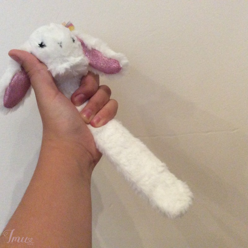 Miela zuikučio apyrankė. Apsivinioja aplink ranką, nespaudžia, kadangi reguliuojasi dydis.